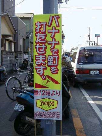 その昔「マイナス40℃の世界ではバナナで釘が打てます・・・」というCMがありましたが、はたしてこの捨て看板はなんでしょう?写真では分かりにくいですが、「くつろぎサロン」という種類のお店で、「Penny's」という店名もなかなかですが、バナナで釘は意味がわかるようでわからない・・・