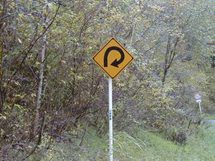 ぐわぁぁあ、こんなに道が曲がっているのかぁぁあ! これじゃあもと来た道に激突するじゃないかぁぁあ! 同じようなカーブが連続しているのになんでココだけこんな標識立てているんだぁぁあ! うわぁぁあ!