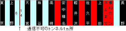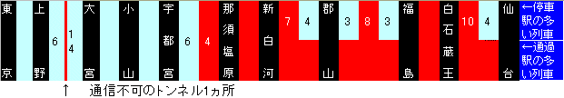 ※通話可能・不可能はNTTDoCoMoの携帯電話を使用した場合の目安です。 ※数字は通話可能、不可能エリア混在区間での通話時間の目安です。列車の停車・通過により変化します。 ※通話可能時間の数字が無い区間は発車後4分間以上続く場合を「通話可能エリア」としています。 ※ほとんどの区間は実際に乗車して調べたものです。 |